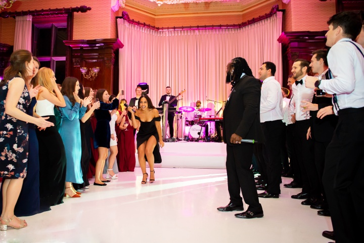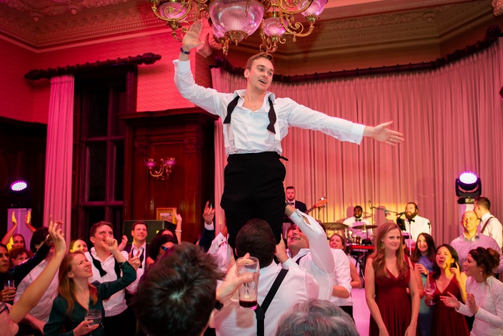 As the guests left the Repton Hall and made their way into the party space, we began the evening's entertainment with our interactive entrance set. This was followed by Ed and Amy's first dance, and they chose Song Bird by Fleetwood Mac. Dancing in such a stunning room and surrounded by our spectacular production, their choreographed dance was an elegant and classy start to the evening.